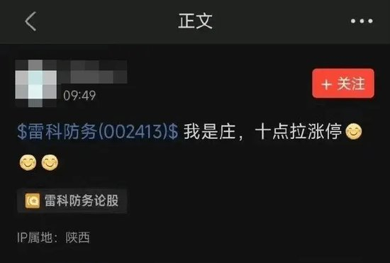 今天9时49分,有投资者在同花顺雷科防务的论股社区发帖称:“我是庄,十点拉涨停。”当时雷科防务股价涨幅约1.2%,且成交量相对平稳。