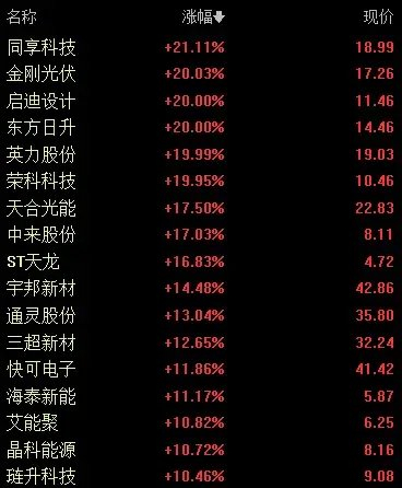 回到今日盘面,午后,以光伏板块为代表的新能源主线显著复苏。截至收盘,申万电力设备指数上涨2.72%,涨幅居所有一级行业首位。金刚光伏、东方日升、英力股份等多只光伏股收获20%幅度涨停。