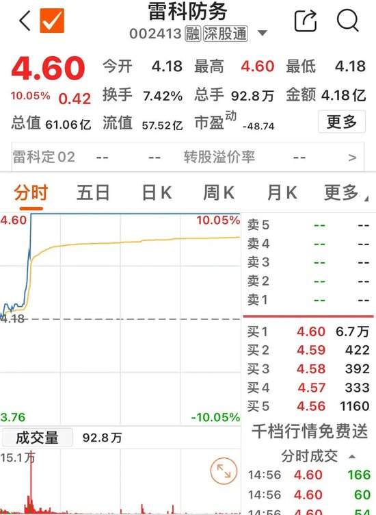 截至今日收盘,雷科防务收获涨停,股价报4.60元/股,涨停板封单留有6.7万手,全天成交4.18亿元,换手率7.42%。