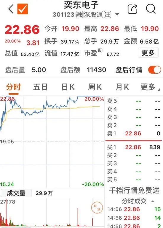 今日盘中,奕东电子股价大幅走强,于9时45分03秒首次触及20%幅度涨停,精准命中上述“预言”。此后经过高位震荡,奕东电子收盘仍然封住涨停。