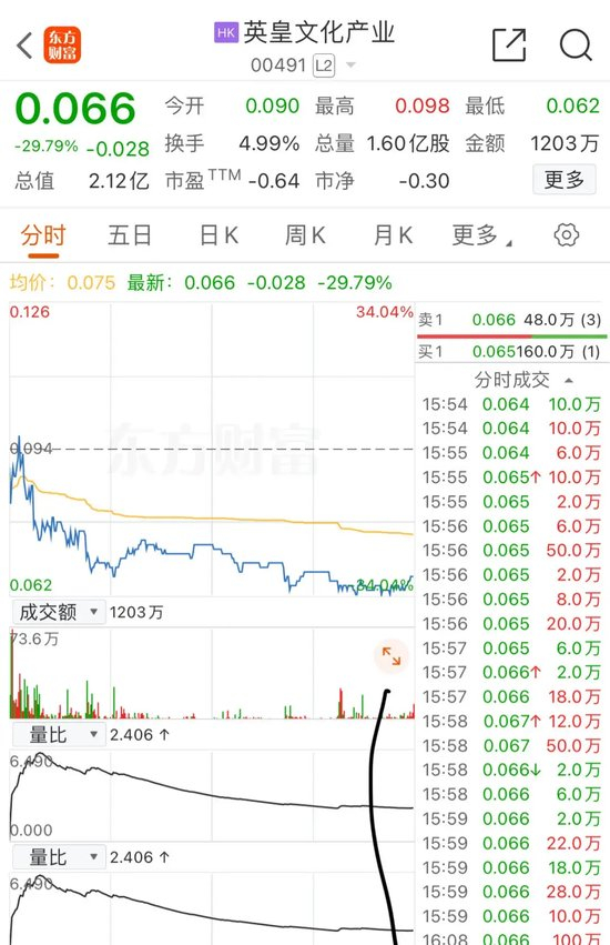 今日英皇文化产业低开低走。截至收盘,该股跌29.79%,报0.066港元/股,成交额1203万港元。5月21日,英皇文化产业涨154.05%,成交额2121万港元。