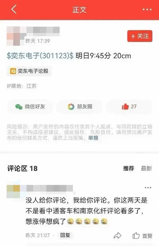 据各大论坛流传的一张截图,同花顺奕东电子的论股社区中,昨日17时左右有投资者发帖称:“明日9:45分 20cm。”当时还有人评论:“想涨停想疯了。”