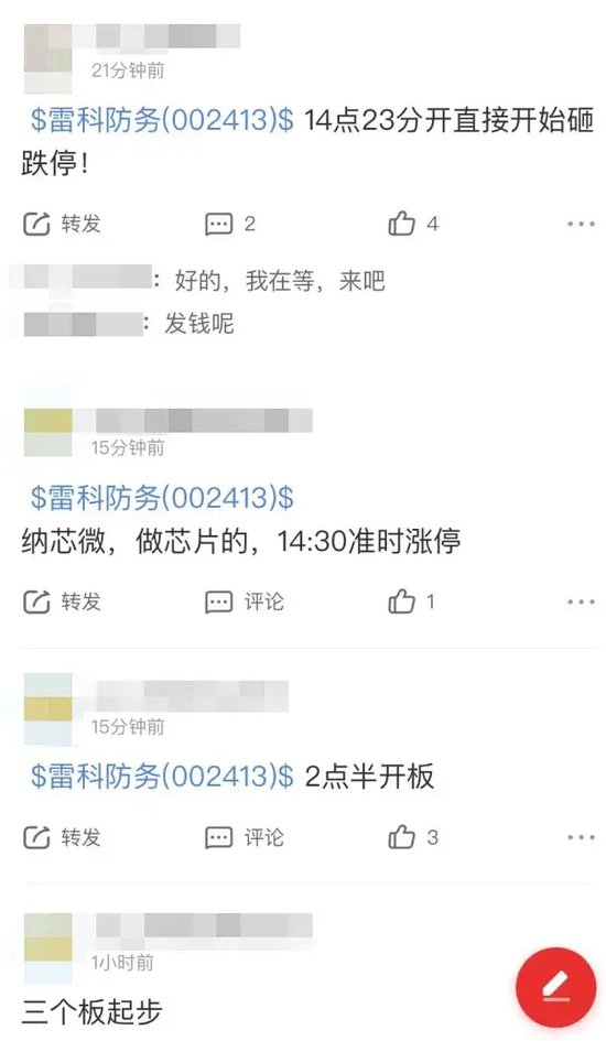 记者发现,仅同花顺雷科防务的论股社区中,一连多篇帖子都是关于个股何时涨停、何时跌停、何时开板的预测。但事后来看,这些预测都与相关个股的实际表现相差甚远。