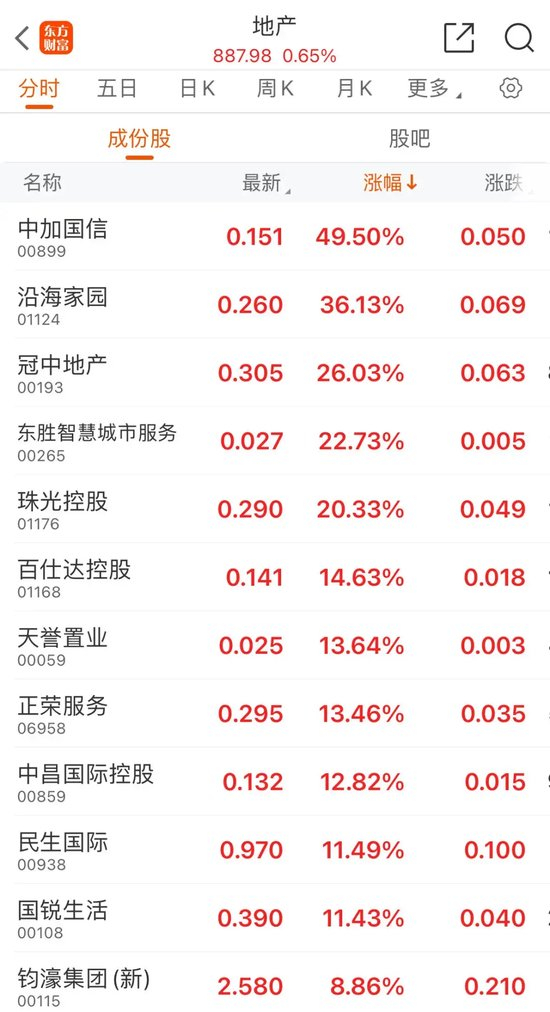 今日港股地产板块继续“狂飙”。截至收盘,中加国信涨49.5%,冠中地产涨超26%,珠光控股涨超20%,百仕达控股、天誉置业、正荣服务、中昌国际控股等涨超12%。