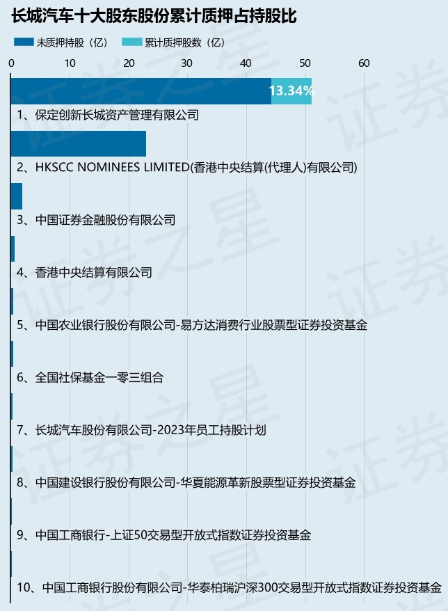 截止本公告日,股东保定创新长城资产管理有限公司已累计质押股份6.83亿股,占其持股总数的13.34%。本次质押后长城汽车十大股东的累计质押股份占持股比例见下图: