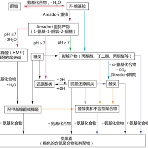 即使我们无意在本文深究其中的化学转化细节,也可以敏锐地从图1所示转化路线中感受到,温度、脱水的速度、pH 值、糖的种类等是调控梅拉德反应路径与进行程度的关键。