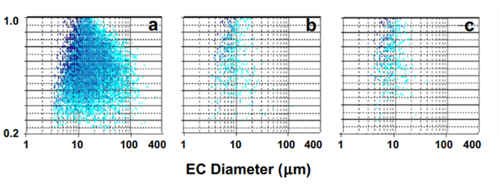 图 3 加热对蛋白质组装结构粒径的影响。a、模拟的生肉;b、100℃ 加热 10min 后;c、100℃ 加热 30min 后。图片来源:参考文献[5]