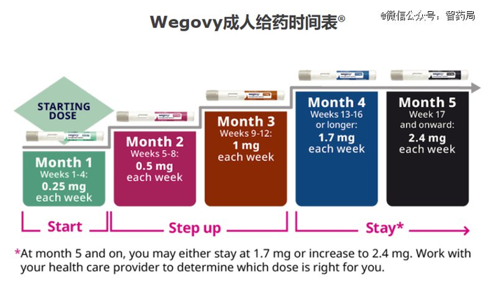 司美格鲁肽每周注射一次,该药物有 5 种不同的剂量强度,起始剂量为0.25毫克,后续每月逐渐增加。