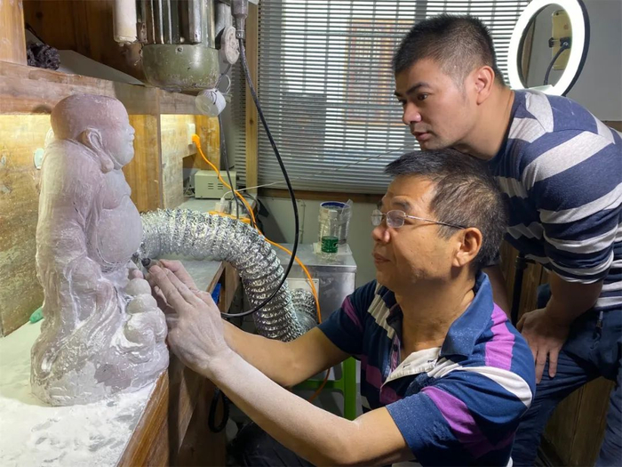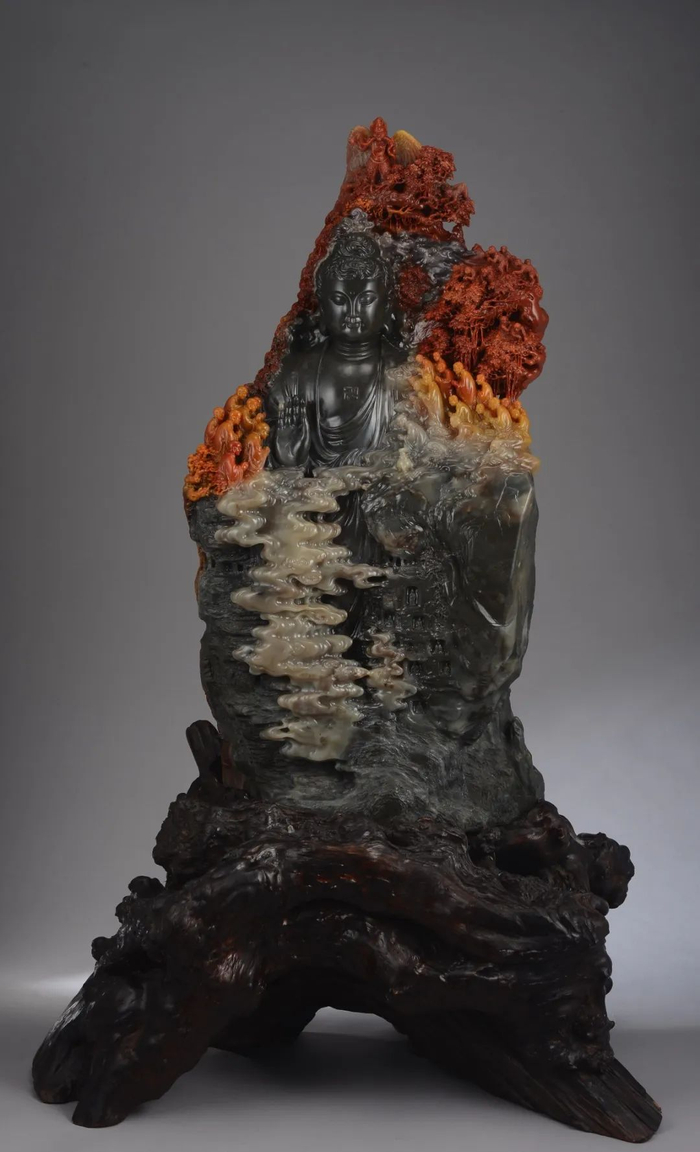 他今年获得百鹤金鼎奖的作品《灵山圣境》,在重点雕刻了佛祖头像和一支手掌的同时,将佛身其他部分和佛窟等采用写意技法简化处理,让观者从佛祖庄严安详的神态中感悟“修道即是修行”的内涵,也充分体现了作品的内在气韵和作者的创作情趣。