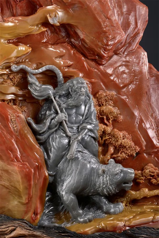 林鹤2023年获得第三届中国工艺美术博览会文创设计大赛金奖的作品《骑虎下南山》,精细处理了鬼谷子长长的胡须、头发和手中的拂尘向后飞舞的状态;奔驰的老虎充满霸气和张力;而两侧和背后的高山峻岭,则采用大写意技法简单勾勒,还原了云梦山的幽深和神秘莫测,让鬼谷子骑虎下山气势十足的同时,也让观者能从中感受到这位战国传奇人物对天下大势尽在胸中的从容和淡定。