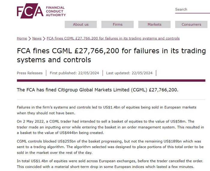 当天,FCA在其官网发布声明称,2022年5月2日,花旗集团在伦敦的一名交易员打算出售价值5800万美元的一篮子股票,但在输入指令时犯了一个输入错误,导致创建了价值4440亿美元的一篮子股票。