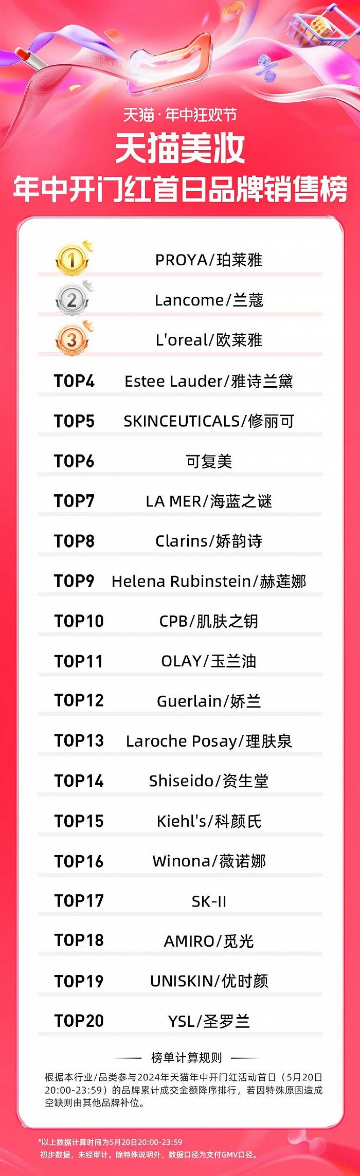 或许是受促销力度调整的影响,从天猫官方披露的618首日美妆TOP20销售榜来看,今年618头部国货美妆的进步比国际美妆品牌更大。