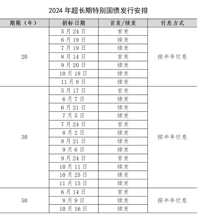 除了利率风险,投资者还需警惕市场投机炒作产生的风险。财政部公告显示,1万亿元超长期特别国债发行期限分别为20年、30年和50年,发行次数分别为7次、12次和3次,付息方式均为按半年付息,发行时间分布在5月中旬至11月中旬。