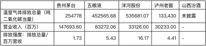 排放总量与企业的生产规模相关,用单位产值的排放强度更能反映企业的环保效率。贵州茅台和泸州老窖披露了其百万工业总产值对应的排放强度,分别为2.95和3.98吨二氧化碳当量。但是,五粮液和洋河股份未直接披露其排放强度数据。