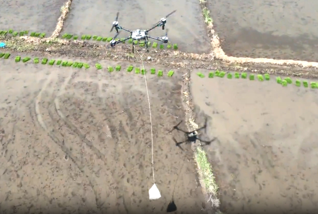 “无人机运苗省时省力,平常一车八九百盘的苗需要人工四个小时左右才能完成,今年只需要两个小时即可。”镇农业农村办公室主任冯昱龙说。