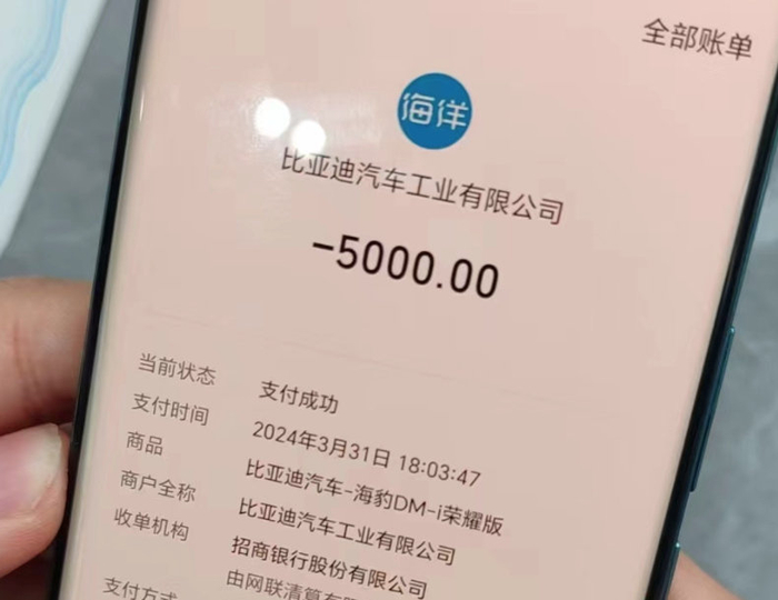 黄先生表示,更重要的是,销售人员用他的手机,现场下单订购的也是新款的海豹DM-i(荣耀版)。定金支付截图和“订单详情”显示,他向“比亚迪汽车工业有限公司”支付定金5000元,订购车型为“海豹DM-i荣耀版”。