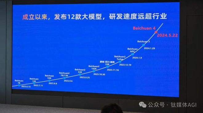 公司成立400多天里,百川智能以月度为单位相继共推出12款大模型,包括Baichuan-7B/13B、Baichuan2-7B/13B、Baichuan3系列、Baichuan-53B、Baichuan2-53B、Baichuan2-192K、Baichuan2-Turbo、Baichuan-NPC等,涵盖开源、闭源、学术科研、国产算力等多个维度。
