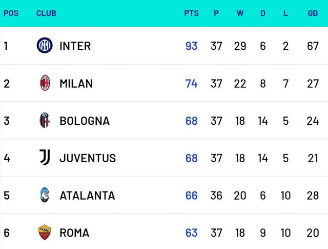 由于意甲第六名罗马领先第七名拉齐奥三分,并且相互战绩占优,因此已经提前锁定了第六名,这意味着如果亚特兰大保持第五名,罗马就可以参加的欧冠联赛。