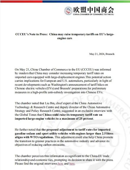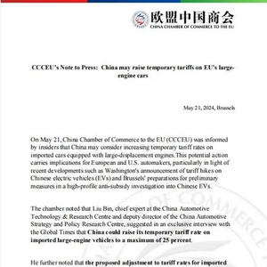2024年5月21日晚间,欧盟中国商会(CCCEU)在X官方账号上发布声明,称其从“内部人士处”获悉,中国可能考虑提高配备大排量发动机进口汽车的临时关税税率。