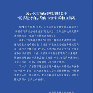 5月22日,贵州省贵阳市云岩区市场监督管理局公布了关于“杨婆婆烤肉店给肉串喷漆”的核查情况。