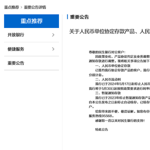 此外,对于智能通知存款产品,民生银行已于2023年停止智能通知存款产品新签约服务。已签约该行智能通知存款产品的客户,存量账户自本公告发布之日起停止自动续存,已续存资金可持有至最近一个到期日,于该日结息并转入活期存款账户。