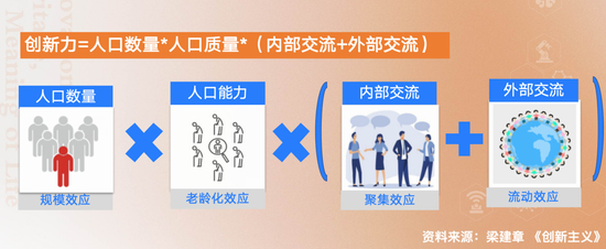 怎么样去培养创新能力,可能是所有经济学家都希望去解答的一个问题,以前一个国家,从一个贫穷国家到中等收入国家,缺的东西很多,比如基础设施或者是一些基础的教育,都是要做的。但到了中等收入国家以后,条件基本上有了,未来能不能成为一个创新型的国家,就是非常难的一件事情,是没有答案的,现在还没有完全解决的一个问题。书里就是把创新力用这样一种公式,以一个框架来思考,创新力如果类比我们说的人工智能或者大脑,它是希望有很多很聪明的大脑,有大脑的数量、大脑的能力,跟其他大脑的或者神经元的数量,神经元能力跟其他神经元的交流;用这样的模型来看一个群体的创新力,人口是基础性的要素,所以人口很重要。人口过去一直是中国的优势,内部交流也是中国的一个优势,因为中国统一的文化,基础设施现在也很不错,统一的法律,所以内部交流很好,相对于欧洲来说,作为一个整体的话,内部交流就比较差。外部交流,中国对外开放以后,外部交流提升很多。所以中国现在最主要的,从这个(创新力)模型来看,过去最大的优势是人口方面的优势,现在确实人口出现了很大的问题,创新力可能会未来随着人口的下降而下降。