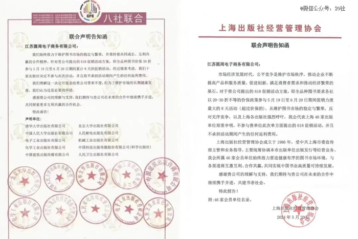 两份出版行业发出的“联合声明告知函”都提到了京东618促销方案,“618期间累计8天以全品种图书价保2-3折进行促销”。