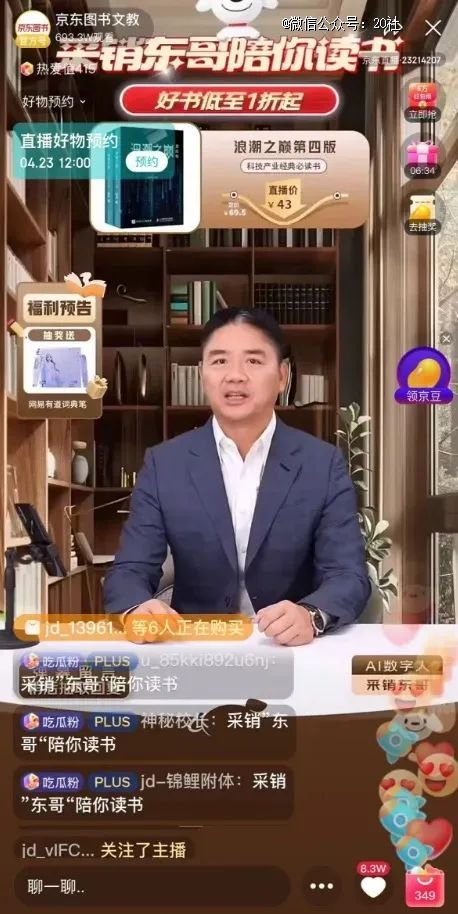 3月又启动了文学月主题活动,有近百家国内主流版权方、发行方参与到活动中。进入4月后,京东图书“423阅读狂欢节”,京东图书采销直播间邀请了多位知名作家,“采销东哥AI数字人”也加入直播荐书中。