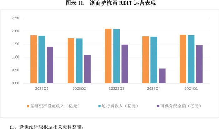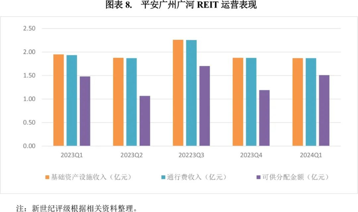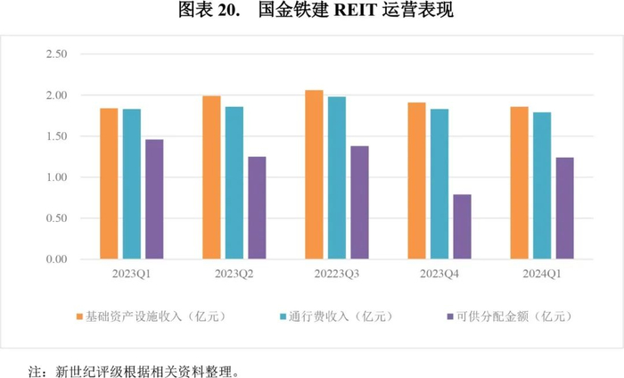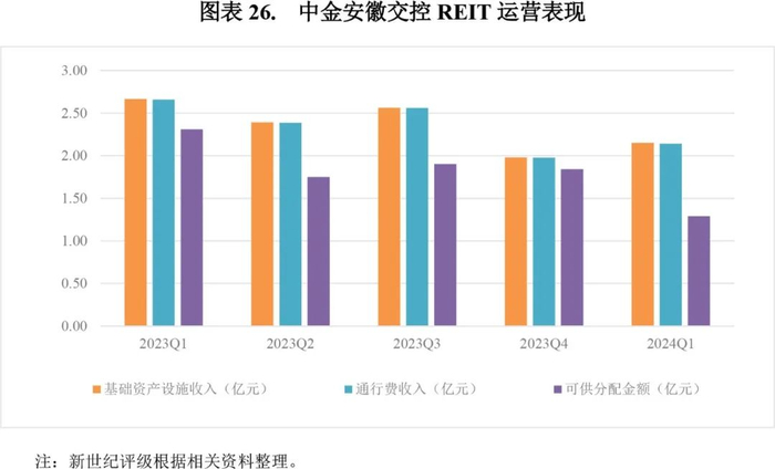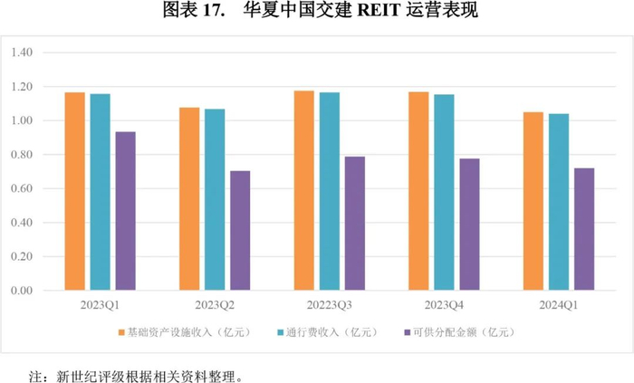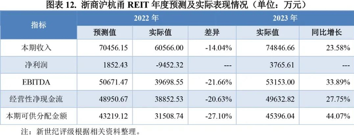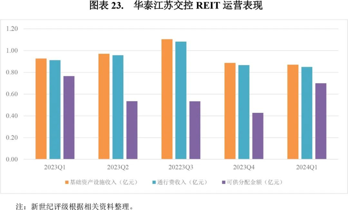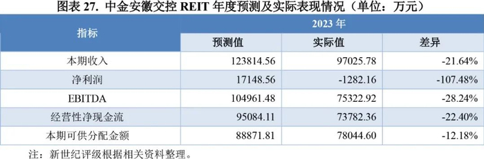 2023年,该REIT实现营业收入为9.70亿元,净利润为-0.13亿元,经营活动产生的现金流净额为7.38亿元,可供分配金额为7.80亿元,净现金流分派率为7.89%。与预测值相比,2023年基础设施的实际运营表现较预测值偏离较大,主要原因为当期周边道路改扩建等多重不利因素导致车流量及通行费收入下降。