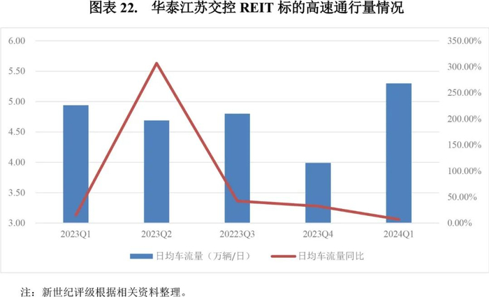 根据季度报告,受货车车流量恢复缓慢影响,该基础设施2023年各季度车流量和通行费收入总体增幅较为平缓。具体而言,由于货运订单量不及预期,叠加柴油价格高企、货运平台抽成比例增加等因素,货运公司和司机通过控制出车车型和空车路线选择等方式进行更精细化的成本管控。此外,与嘉通高速顺接的京港澳高速湖北北段的改扩建工程,使得部分货车司机选择远端绕行路线,对嘉通高速货车流量恢复有一定负面影响。从2023年全年来看,收入增长与车流量增长不一致。标的高速通行费收入4.54亿元,日均通行费收入124.30万元,同比增长8.2%;实现自然车流量919.7万辆,日均自然车流量2.5万辆,同比增长21.2%。