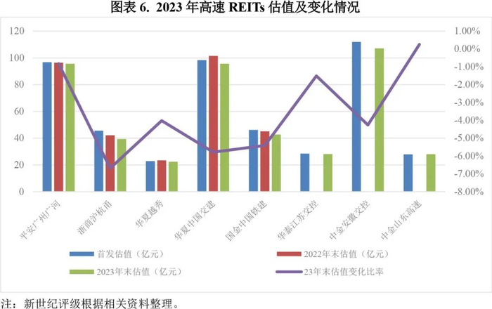 从估值变化来看,除了中金山东高速REIT的标的高速估值较2023年10月首次发行时略有上升,其余REITs产品2023年末的估值较上年末均有不同幅度的下降。估值下调一方面是由于路费收入的预测值较之前有所下降,另一方面受到期限减少的影响,如浙商沪杭甬REIT的通行费收入未明显变化,但由于其特许经营权剩余期限较短,导致估值下降幅度明显。
