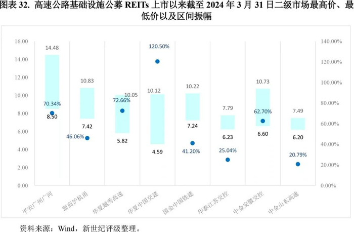 从波动幅度来看,华夏中国交建REIT、华夏越秀高速REIT和平安广州广河REIT的振幅分别为120.50%、72.66%和70.34%,与之相比,华泰江苏交控REIT和中金山东高速REIT的振幅分别为25.04%和20.79%,股价相对稳定。