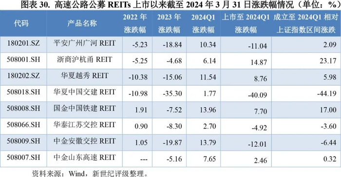 从产品收益率来看,截至2024年3月末,相对于发行价格而言,8只高速公路REITs产品分化明显,浙商沪杭甬REIT、华夏越秀REIT、国金中国铁建REIT和中金山东高速REIT呈溢价状态,其余4只高速公路公募REITs产品均表现不佳。其中,浙商沪杭甬REIT较发行价上涨了约15%,表现最好;华夏中国交建REIT较发行价下跌了约40%,表现最差。分年度看,2023年高速REITs均出现不同幅度的下跌,2024年一季度,高速REITs的二级市场价格回暖。