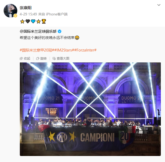 此后,国米在第2个赛季就重返欧冠赛场。8年时间与员工、球员和教练一起赢下7座奖杯,经历2次欧战决赛,2次问鼎意甲。如今,在张康阳33岁收获再度夺冠的喜悦时,他即将失去国米的控制权。以往总会在社交平台分享喜悦,这次的他沉默了。