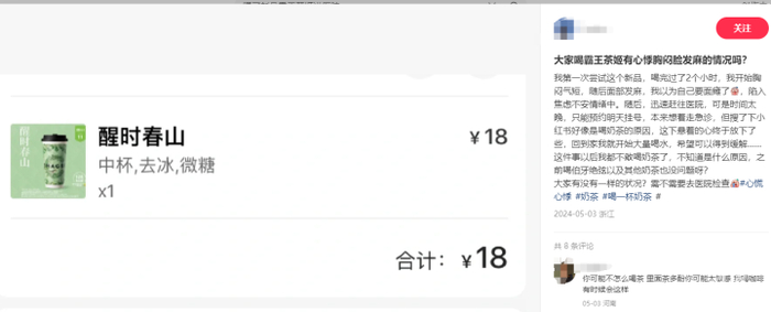 今年四月,就有不少网友反映喝了一杯霸王茶姬的另一款饮品“醒时春山”,进了医院。