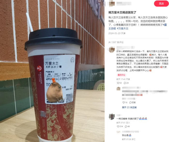 近日,有多位网友在社交平台反映称,自己喝了霸王茶姬新品“万里木兰”奶茶后出现心慌心悸等不适症状。