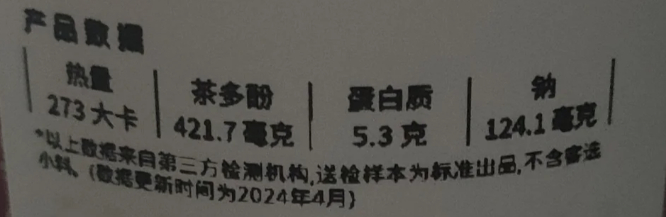 配料表显示,这款饮品含有咖啡因约121.7毫克,茶多酚约546.1毫克。