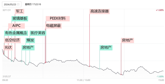 财联社5月23日讯,今日25股涨停,8股炸板,封板率为76%,正虹科技4连板,英力股份20CM3连板,新华联、渝开发3连板,上工申贝、哈三联、清源股份、拓日新能、天宸股份2连板,至正股份4天2板,北交所阿为特、凯华材料30CM首板。总体上个股跌多涨少,全市场超4500只个股下跌。沪深两市今日成交额8477亿,较上个交易日放量165亿。板块方面,PEEK材料、AI PC、次新股、军工等板块涨幅居前,贵金属、有色金属、教育、短剧等板块跌幅居前。截至收盘,沪指跌1.33%,深成指跌1.56%,创业板指跌1.38%。