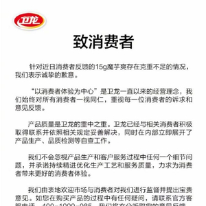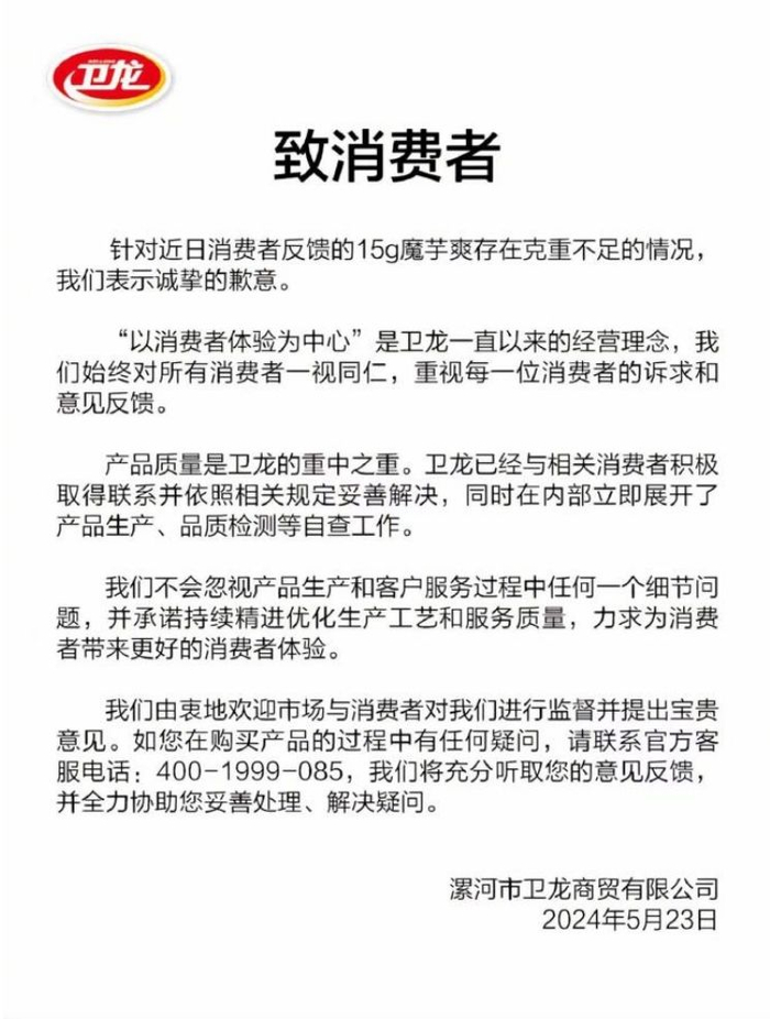 23日下午,卫龙官方在抖音发布致歉声明称,针对近日消费者反馈的15g魔芋爽存在克重不足的情况,表示诚挚的歉意。卫龙已经与相关消费者积极取得联系并依照相关规定妥善解决,同时在内部立即展开了产品生产、品质检测等自查工作。