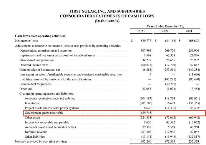 从第一太阳能的2023年报来看,第一太阳能全年实现8.31亿美元净利润,其中约有6.6亿美元(合48亿元人民币)来自补贴的(Government grants receivable)占比达到了80%,而2021年、2022年,该项收益为零。