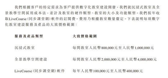 根据招股书,该业务主要是提供提升师生之间互动的软件以及硬件。具体来看,主要包括三部分,分别是沉浸式教室、全景教学空间建设以及Livecourse软件。