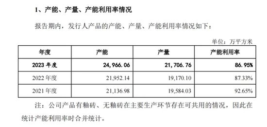 此外,从企业产能利用率的角度看,招股书显示,2021-2023年,马可波罗的产能约为2.1亿平方米、2.2亿平方米、2.5亿平方米;产量分别为1.95亿平方米、1.92亿平方米、2.17亿平方米,对应产能利用率分别为92.65%、87.33%、86.95%,同时各期闲置产能分别为1,552.95万平方米、2,782.04万平方米、3,259.30万平方米。