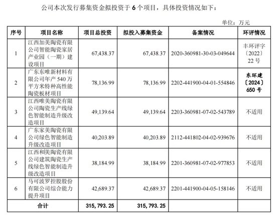 招股书显示,马可波罗拟募资31.58亿元,募集资金拟投资于6个项目,其中江西加美陶瓷有限公司智能陶瓷家居产业园(一期)建设项目、广东东唯新材料有限公司年产540万平方米特种高性能陶瓷板材项目,这两个募集资金投资项目全面投产后,将共计新增建筑陶瓷产品年度产能1540万平方米。
