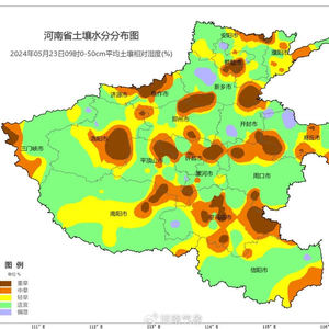 过去3天全省平均气温24.4℃,累计降水量0.3mm。20日、22日,西部、南部出现阵雨、雷阵雨。5月23日9时0~50厘米自动土壤水分监测数据显示:全省适宜站点比例为42%,干旱站点比例为48%,干旱站点主要分布在鹤壁、洛阳、郑州、商丘、平顶山、驻马店大部和新乡南部、焦作北部、周口北部、许昌中东部、南阳中部等地(图1)。与昨日相比,干旱站点比例增加1个百分点。
