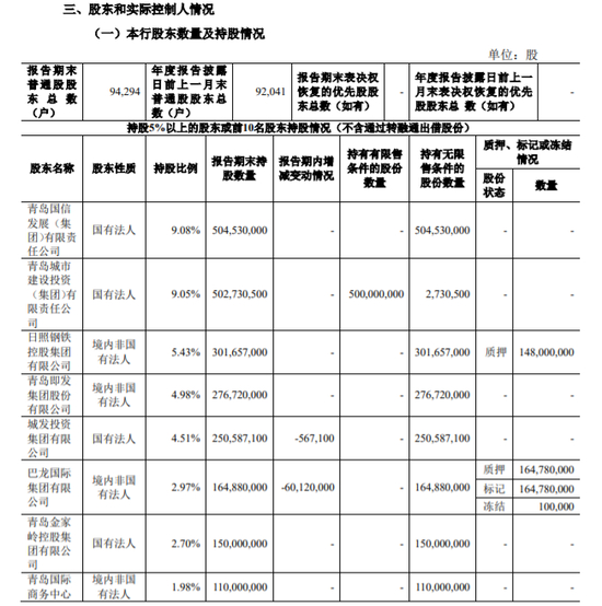 截至2023年末,仅巴龙集团还持有青岛农商行1.65亿股股份,且均处于质押、标记或冻结状态。