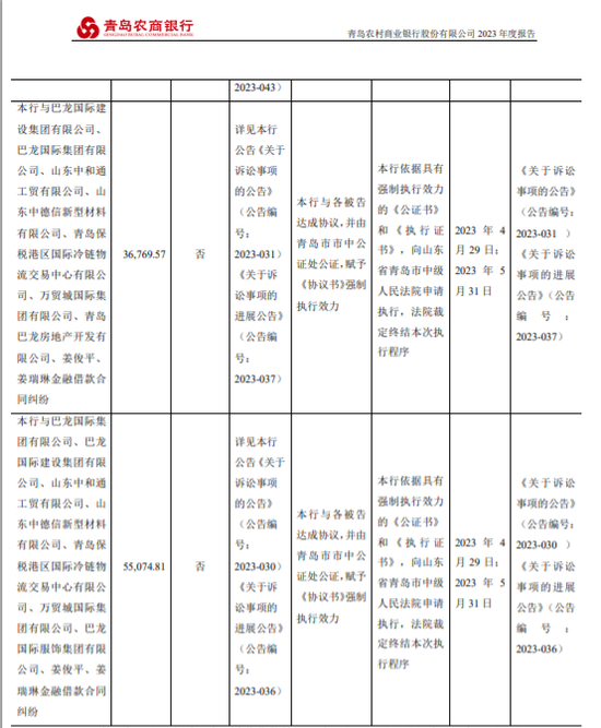 2023年5月24日,青岛农商行公告称,因债务问题,青岛市黄岛区人民法院公开拍卖了该行股东巴龙国际集团有限公司、巴龙国际建设集团有限公司所持该行的部分股份,涉及巴龙集团持有的6012万股股份,占青农商行总股本的1.08%;以及巴龙建设持有的1873万股股份,占青农商行总股本的0.34%。不过,当时的拍卖因为无人出价而流拍。