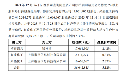 *ST榕泰披露的一份执行裁定书显示,兴业银行汕头分行就其与*ST榕泰、*ST榕泰旗下公司、揭阳市兴盛化工原料有限公司、揭阳泰禾房地产开发有限公司等借款纠纷案,向法院申请拍卖兴盛化工持有的*ST榕泰1667万股无限售流通股票,2023年12月19日,楷巨信息以5895.58万元的出价竞得该笔股权。