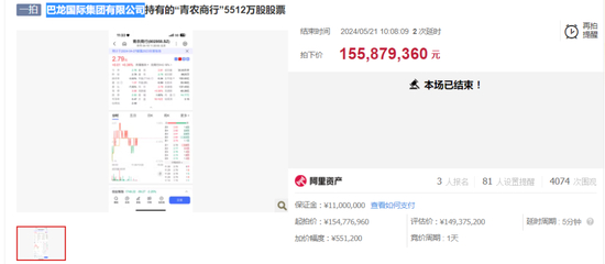2023年12月16日,巴龙国际集团持有的青岛农商行3400万股无限售流通股被挂上京东司法拍卖平台,该笔股权经过237轮紧张竞拍,最终拍出了8719.1万元的价格。