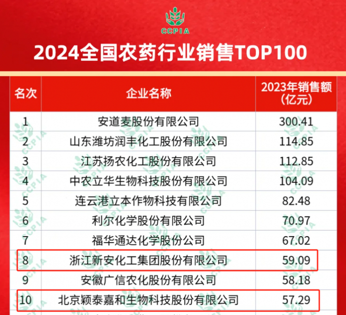 新安股份荣登农药行业销售TOP100榜单,位列第八位