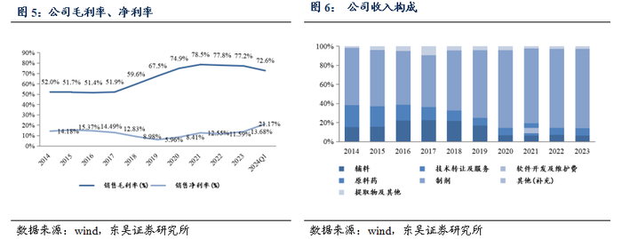 毛利率持续提升。公司制剂业务收入占比从2014年的59.85%提升至2023年的83.06%,药品制剂板块的毛利率从2014年的67.4%提升至2023年的86.23%,受益于高毛利制剂产品快速增长,公司整体毛利率从2014年的51.96%提升至2023年的77.2%。